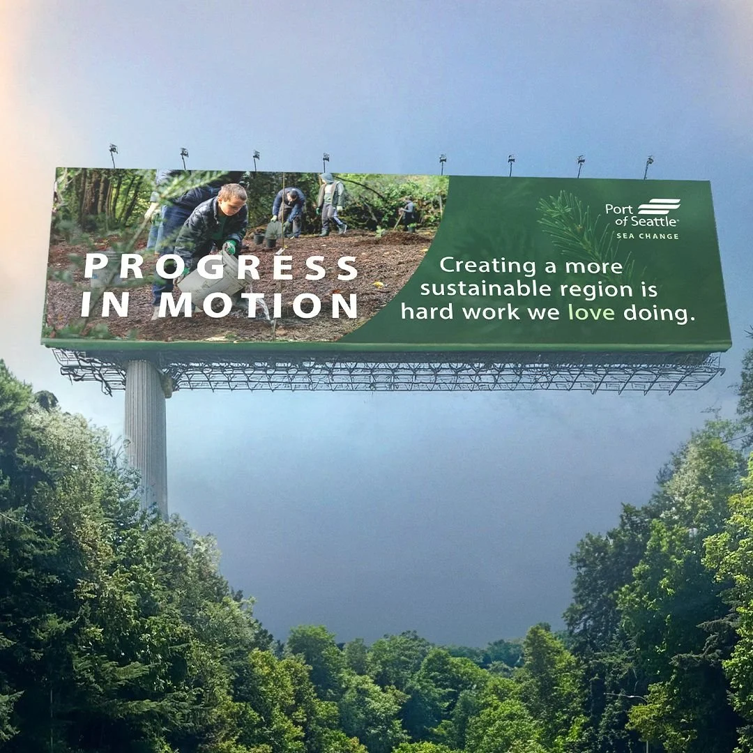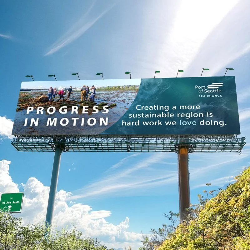 Two billboards placed between the airport and Seattle to amplify Port of Seattle’s sustainability efforts. Placement is everything.